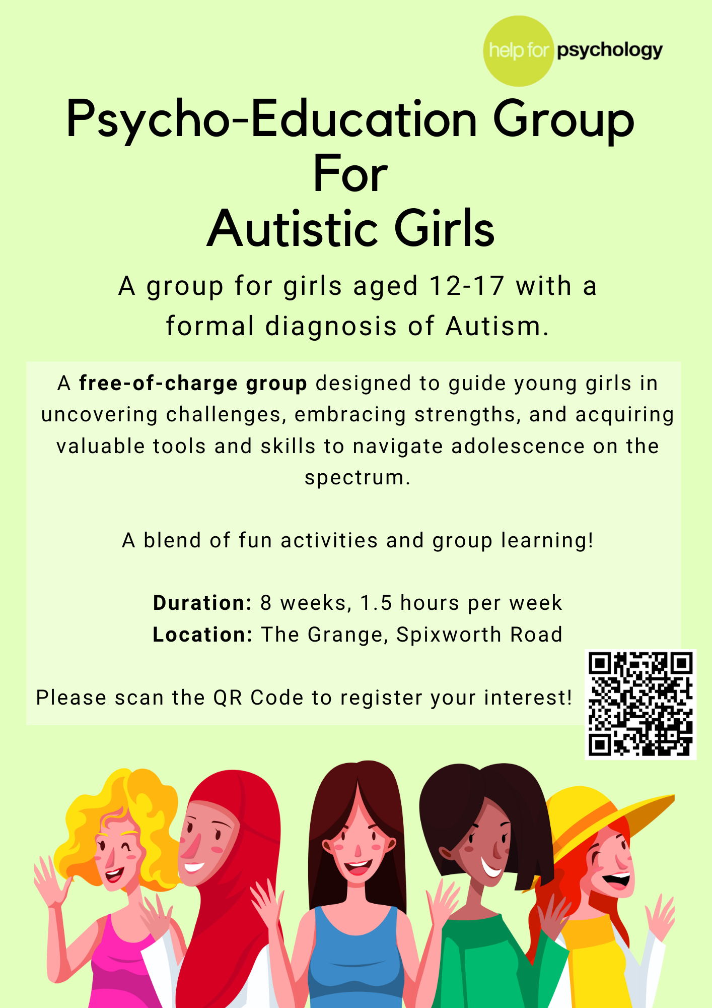 Help for Psychology will be running two free of charge groups for girls aged 12-17. One group will be aimed towards girls aged 12-14 and the other will be aimed towards girls aged 15-17.